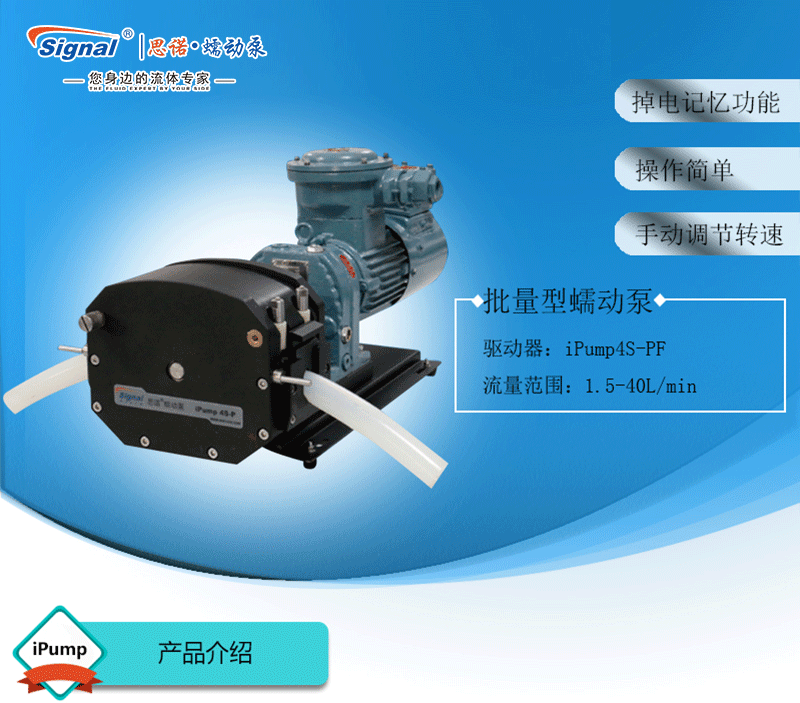 1.流量范圍:1.5-40L/min 2.彈性壓管結構,軟管壽命長,非常適合大流量液體傳輸 3.免維護交流減速電機驅動,變頻器調節(jié)轉速 4.全金屬泵頭,高精度,更可靠 5.防爆等級DIIBT4,適合易燃易爆環(huán)境使用