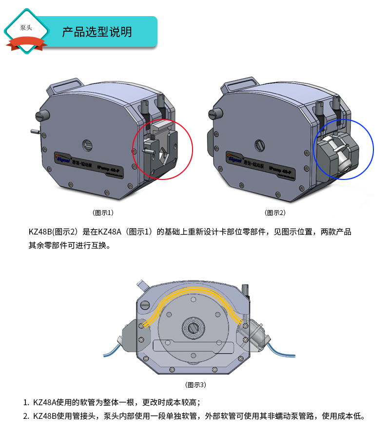 ? ? ? ? ? ?2.? KZ48B使用管接頭,泵頭內(nèi)部使用一段單獨(dú)軟管,外部軟管可使用其 非蠕動(dòng)泵管路,使用成本低。