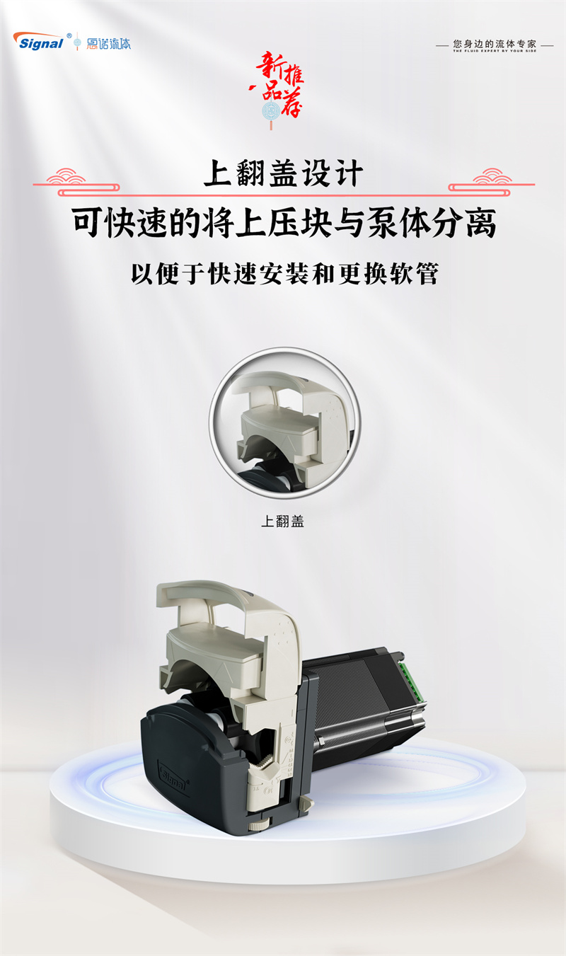 3.?上翻蓋設計,可快速的將上壓塊與泵體分離,簡化了軟管的安裝和更換流程,顯著提升維護效率。