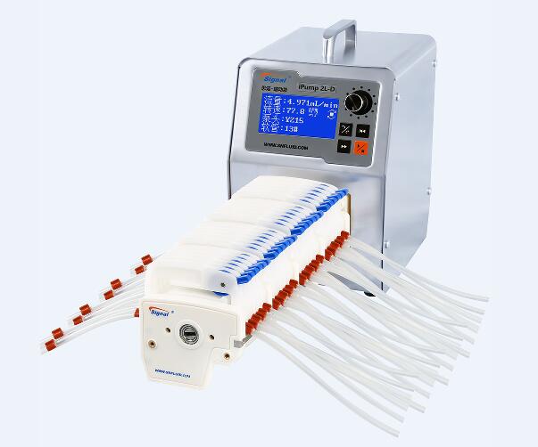 多管蠕動(dòng)泵泵頭適用于微小流量多通道同步液體傳輸環(huán)境,參考流量在水的前提下是75.12毫升每分鐘。DG泵頭滾論數(shù)分為兩種,6滾輪和10滾輪,前者流量大一些,后者相對流量小,精度高,脈沖小一些。經(jīng)常會(huì)在常規(guī)調(diào)速型蠕動(dòng)泵上面看到這款泵頭的身影。