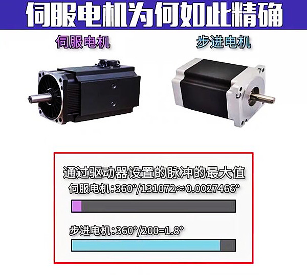 伺服和步進所指電機部分,伺服電機和步進電機一樣都是電機走一圈,脈沖數(shù)越大每一步的角度就越小精度就越高,而伺服電機軸后端如果是17位編碼器的話,那么驅(qū)動器每接收131072個脈沖信號電機才轉(zhuǎn)一圈,也就是它走一下,僅移動了0.0027°,那么它步進角為1.8°步進電機的655倍,而大部分步進電機只能設(shè)置到25000個脈沖, 所以說伺服電機的精度是步進電機,同時伺服電機是閉環(huán)控制,有效的反饋也了電機。